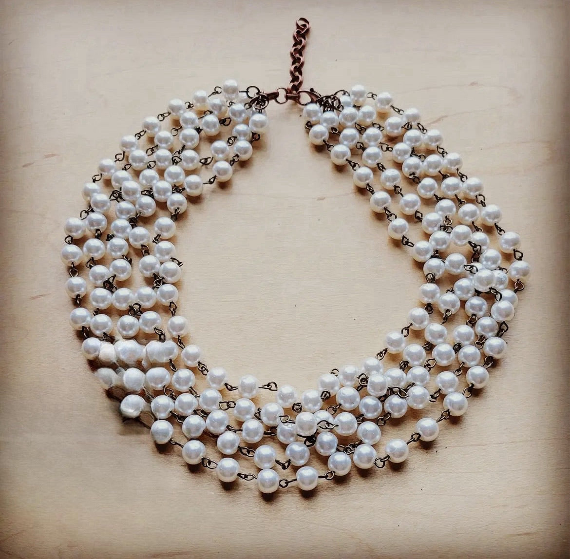 Combining the fun loving bohemian spirit with the classic beauty of pearls this necklace is everything y’all! Whether you choose to wear it with your fave jeans and a tee or as the finishing touch to a flowy dress and jean jacket this necklace is a fantastic option. Five strand pearl chain collared length necklace. Made in the USA. Clasp closure with 2” extender.